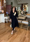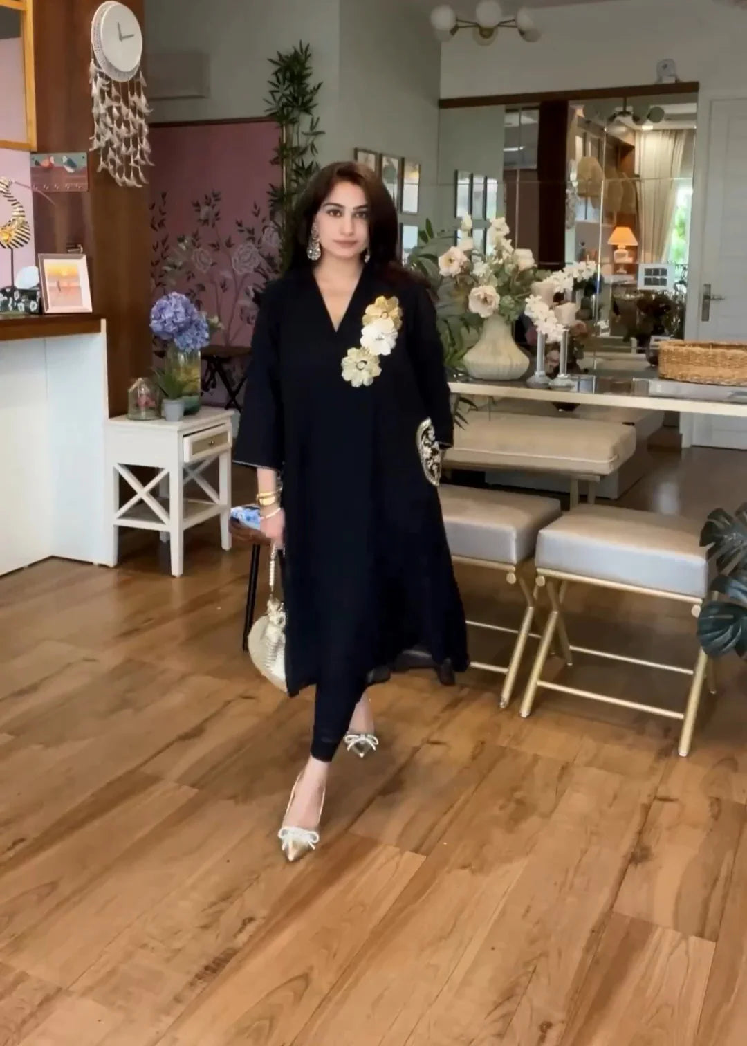 Add an edge of sophistication to your wardrobe with our Black Co-ord Set, crafted in premium 60x60 woven pure cotton. Designed for both work and after-hours glam, this breezy summer ensemble features intricate floral embroidery on the neckline and pocket—adding a touch of luxury to its minimalist silhouette.