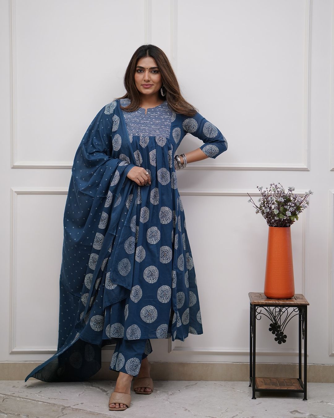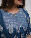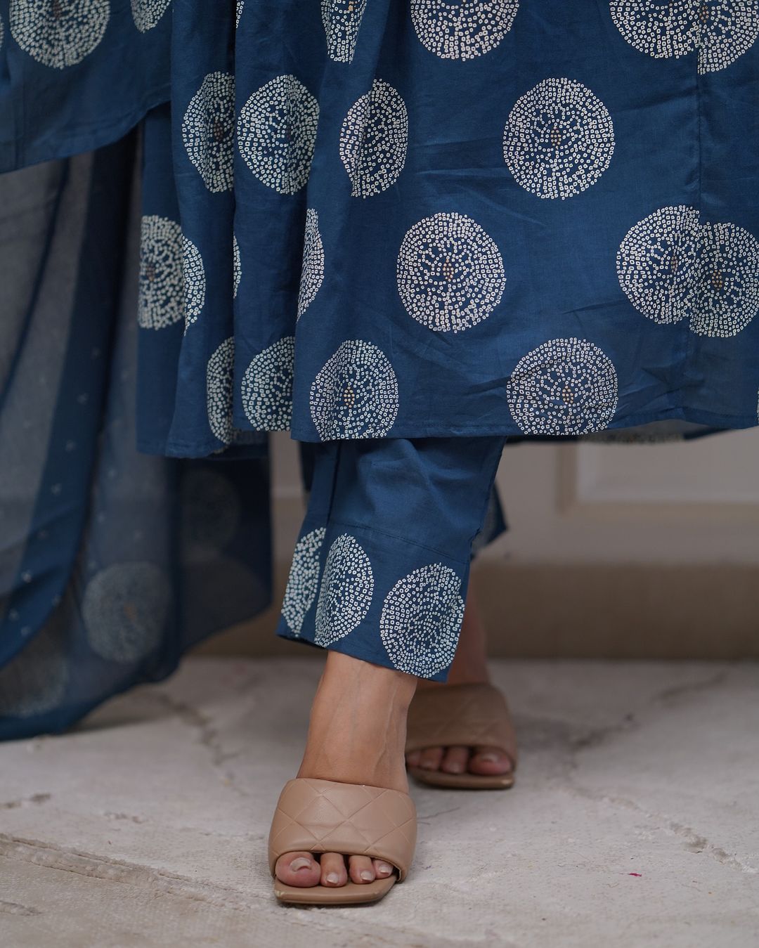 Cyan Blue Long Flared Bandhani Printed Kurta Pant & Dupatta Set