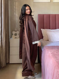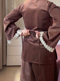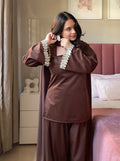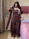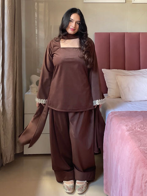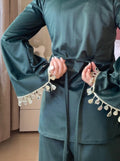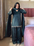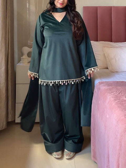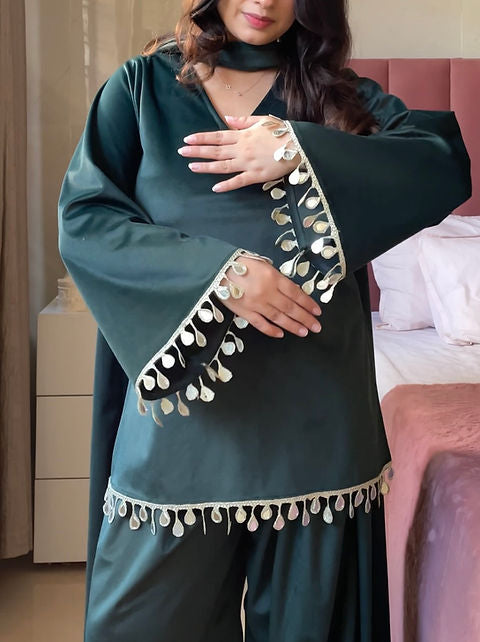 This green silk kurti set features flared sleeves, a V-neckline, and elegant mirror-lace detailing on the sleeves and hemline. Paired with a matching 2.5 m dupatta and farshi salwar, it offers a luxurious, timeless look. Fully customizable