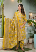 Women Yellow Floral Printed Mirror Embellished Straight Kurta Paired With Afghani Bottom And Printed Dupatta
