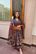 Step into ethnic elegance with this beautifully printed Anarkali suit set in earthy rust and deep blue hues. Crafted from breathable pure cotton, the kurta features all-over folk-inspired motifs that reflect traditional artistry. The set includes a coordinated bottom and a matching dupatta, making it a perfect ensemble for festive gatherings, casual outings, or cultural celebrations.